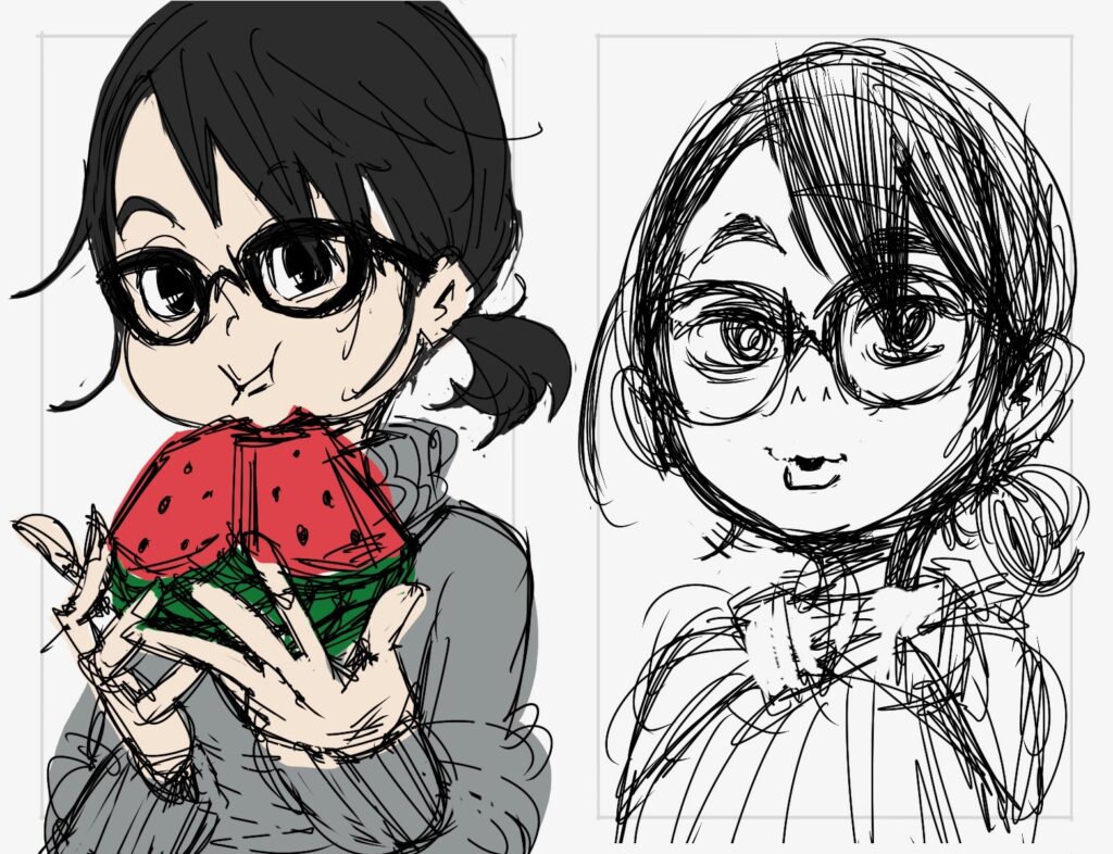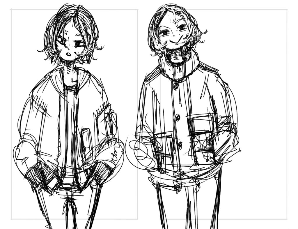 | 佐藤さん(主人公) スイカの似合うパステルカラーな服装 (白Tシャツ+デニム) 片足の浮腫を隠したいからデニムは足首を隠すくらいルーズフィット | 森下さん(援助者) 片腕の弾性着衣を強調するため、インナーは白Tシャツ アウターはMA-1っぽいイメージ 腕の浮腫を隠したいから夏も長袖 |